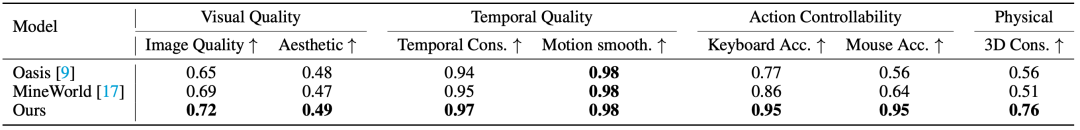 在GameWorld Score评测系统中,Matrix-Game在视觉质量、时间一致性、动作可控性与物理规则理解四大维度上均取得领先成绩,全面超越现有开源基线模型 Oasis 与 MineWorld。